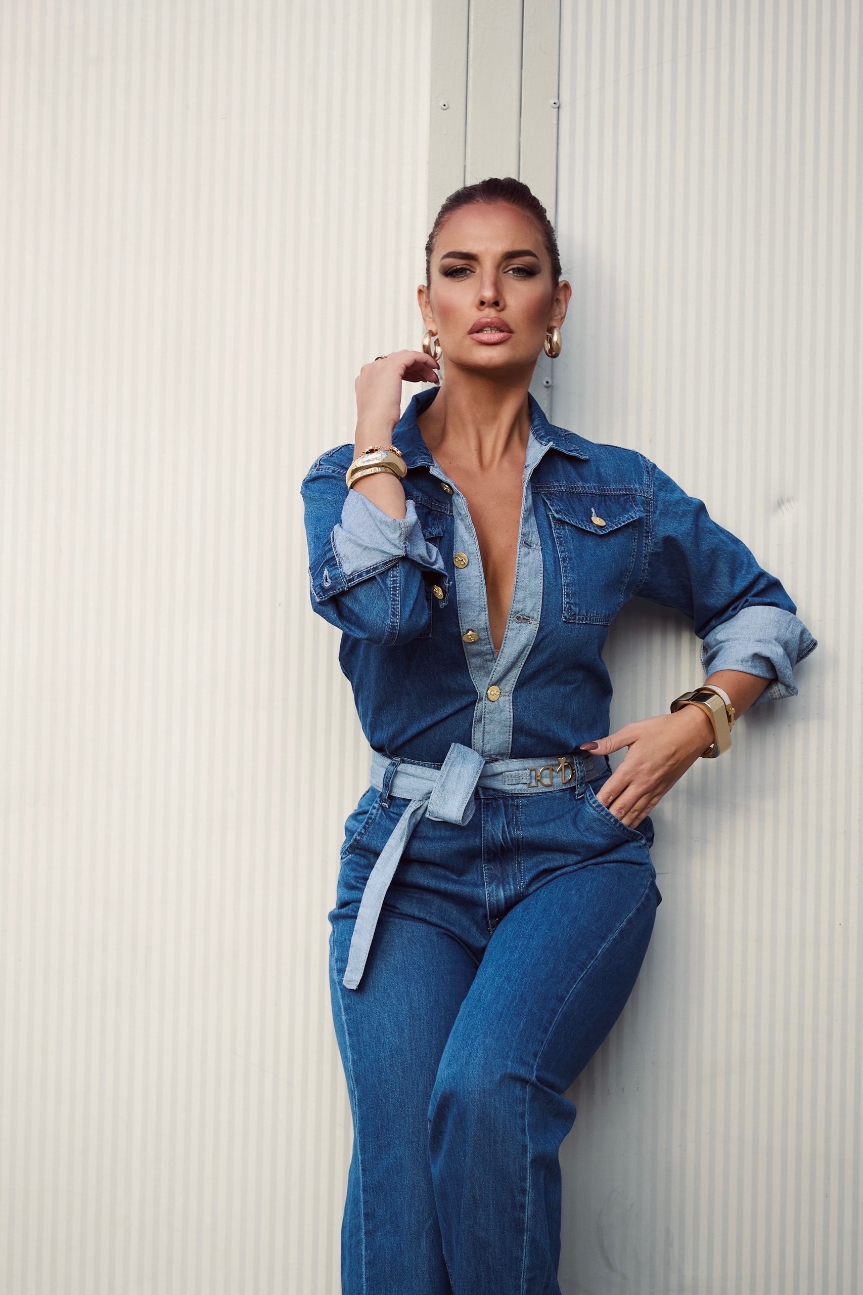 Kombinezon od tankog teksas materijala. Dugih rukava sa dugim nogavicama, tamno plave boje sa detaljima svetlijeg teksasa. Ima zlatnu dugmad i kaiš sa zlatnim DMiD logom. Nogavice su produžene. Materijal je mekan i tanak, nema mnogo elastina. Kroj kod većih veličina je manji.